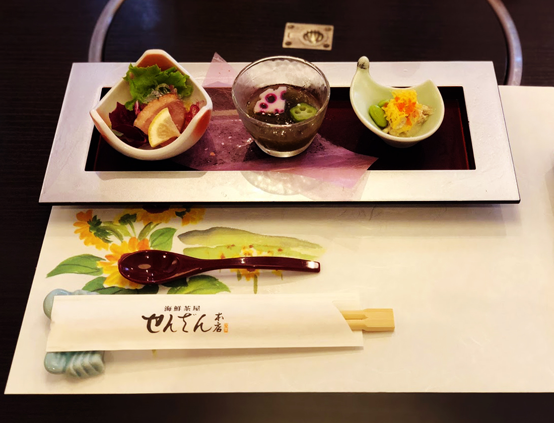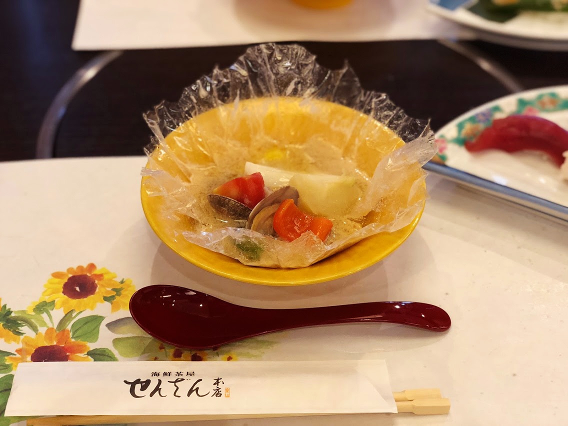 魚介と野菜のスープ仕立て(正式なメニュー名は覚えてないです、、)とお寿司(まぐろ、いくら、えび、えりんぎ、おくら)。
