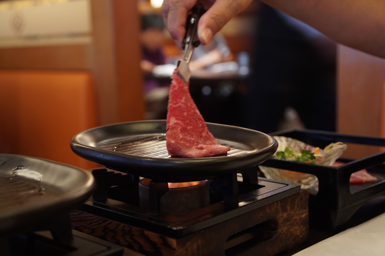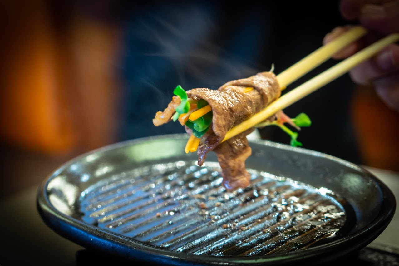 次は焼きしゃぶ。お肉を鉄板で軽く焼いて野菜を巻いて食べます。